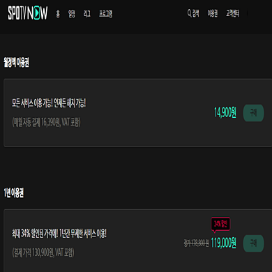 스포티비나우 이용권을 조금이라도 저렴하게 이용하는 방법은 1년 이용권을 구매하는 것입니다. 1년 이용권은 119,000원으로 정가에 비해 34퍼센트 할인된 가격입니다.